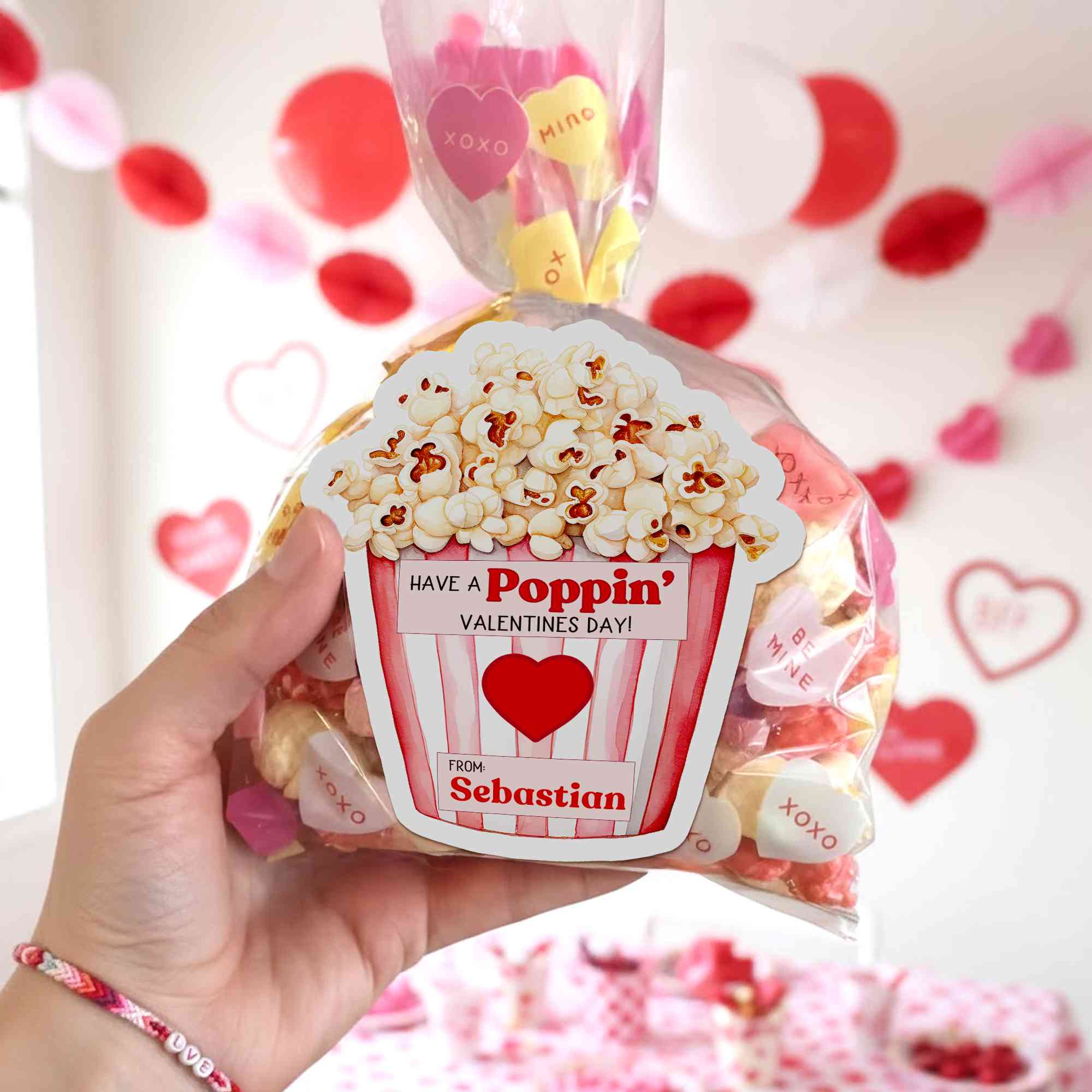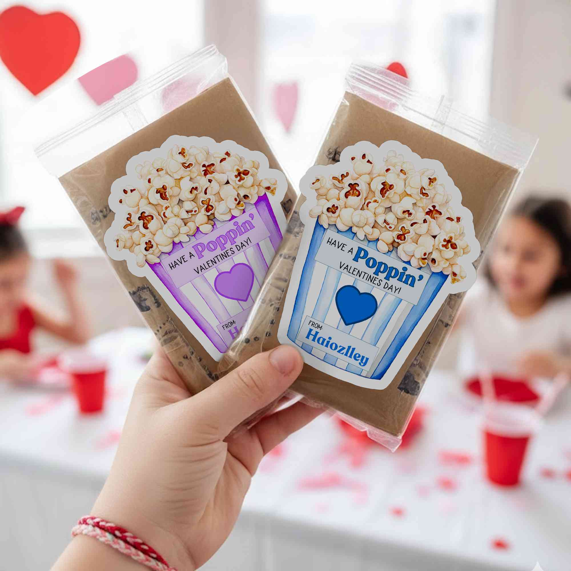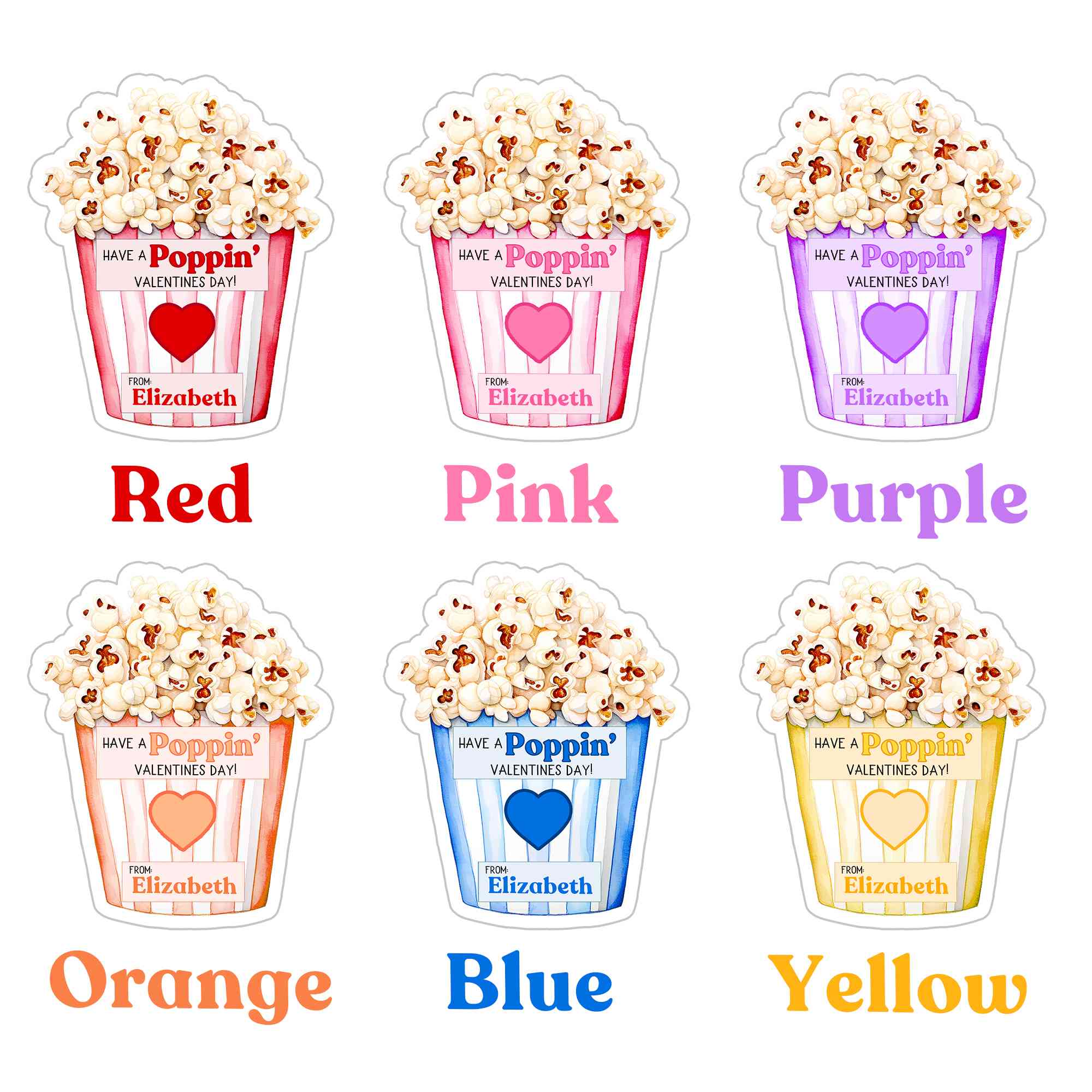 Playful Valentine Design - The sticker set features a cheerful “Have a Poppin’ Valentine’s Day” message paired with heart and popcorn elements, creating a bright and friendly look that feels perfect for kids’ exchanges and sweet holiday moments.
