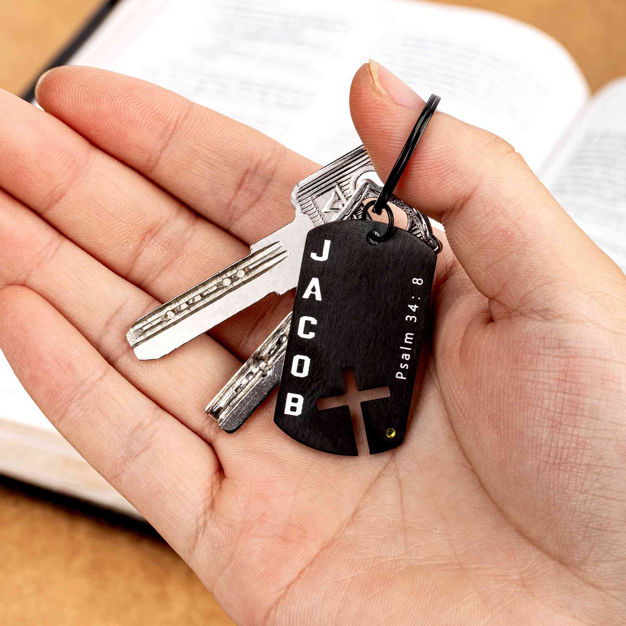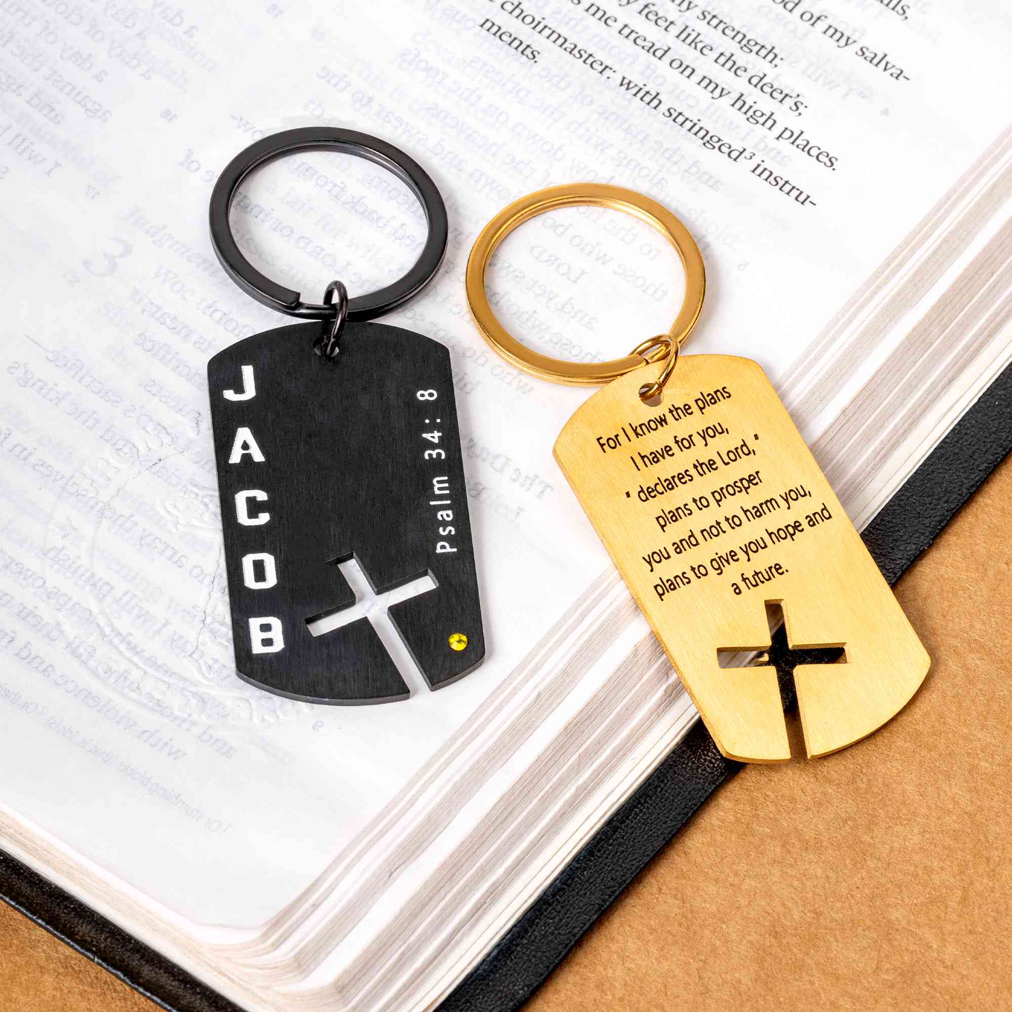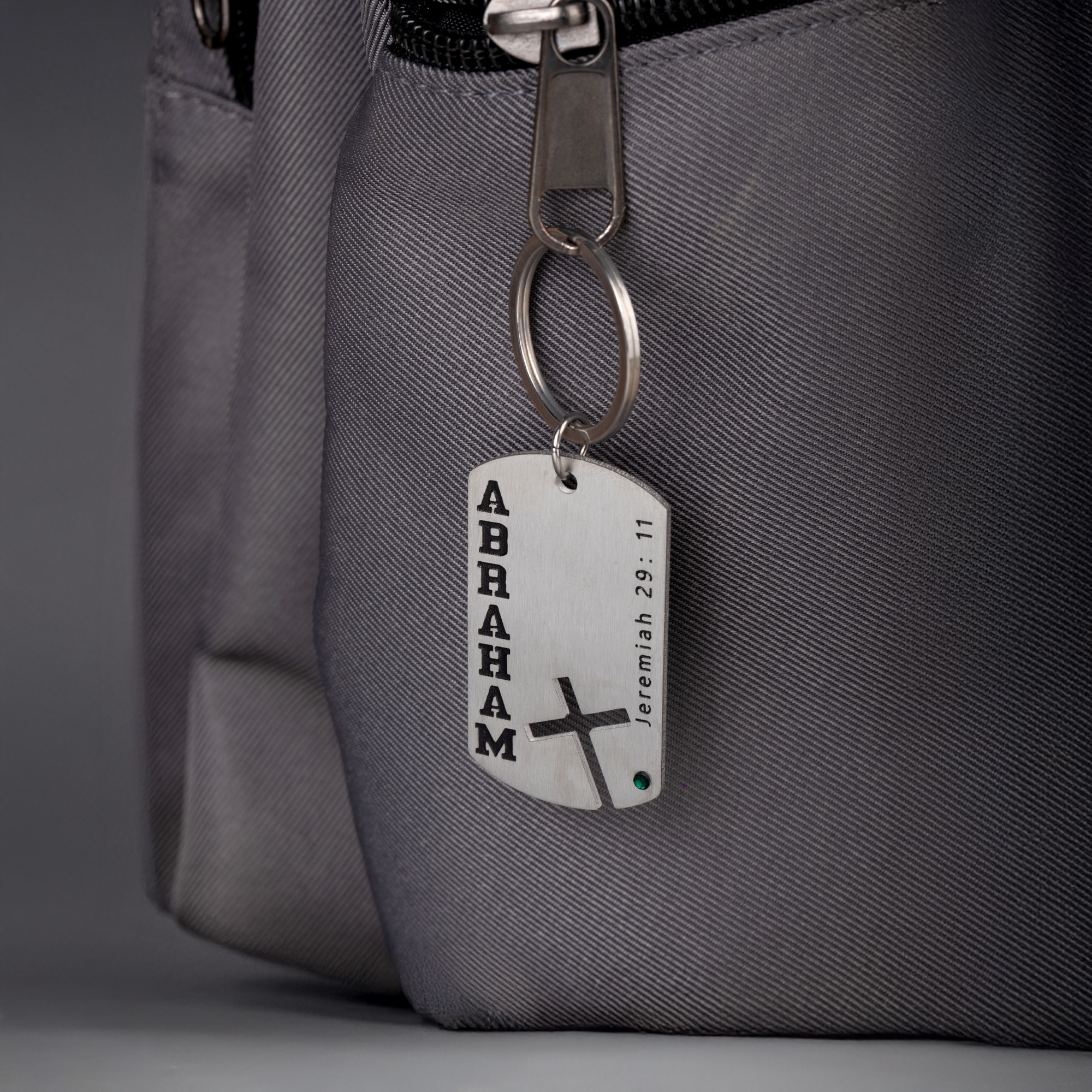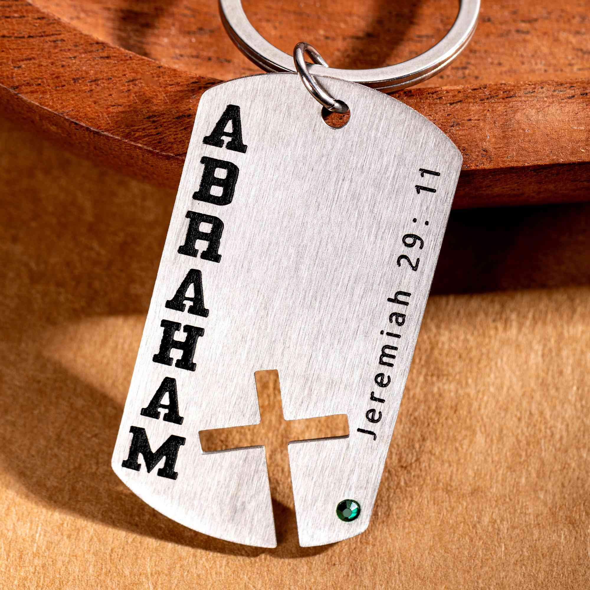 Style Personalized Name Engraved Cross Bible Verse Dog Tag Keychain with Birthstone